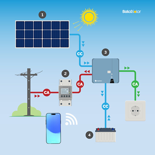 Convierte la electricidad generada por los paneles (en corriente continua) en electricidad apta para tu uso diario (en corriente alterna). Es el “cerebro” del sistema.